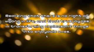Realizing that there is no right or wrong in life, and that true joy lies in transforming unpleasant things into enjoyable ones Realizing that there is no right or wrong in life, and that true joy lies in transforming unpleasant things into enjoyable ones 1